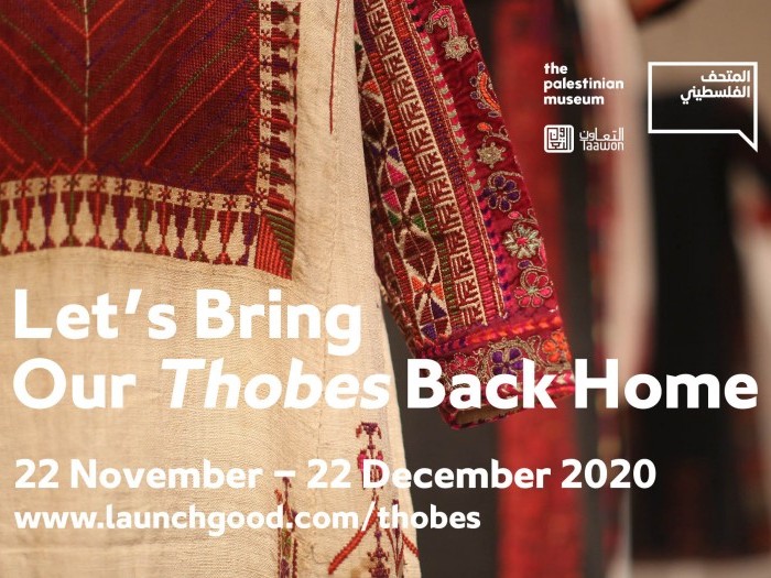 You will receive a thank you letter, campaign updates, a special edition digital poster, a video tour of the Thobes, an exclusive Q&A session with our curator, a 1-year 'friends of the Palestinian Museum membership' in the Khuzama Circle and a personal recognition on our website as an appreciation for your outstanding generous contribution.